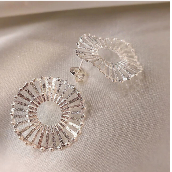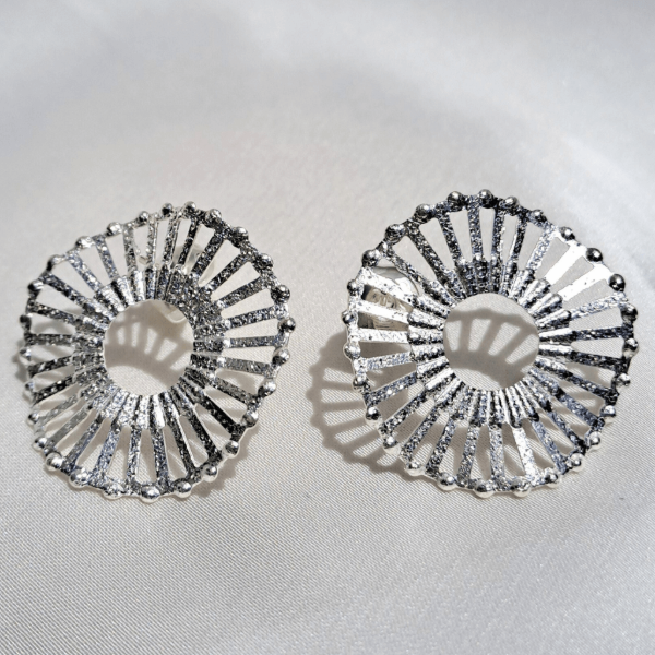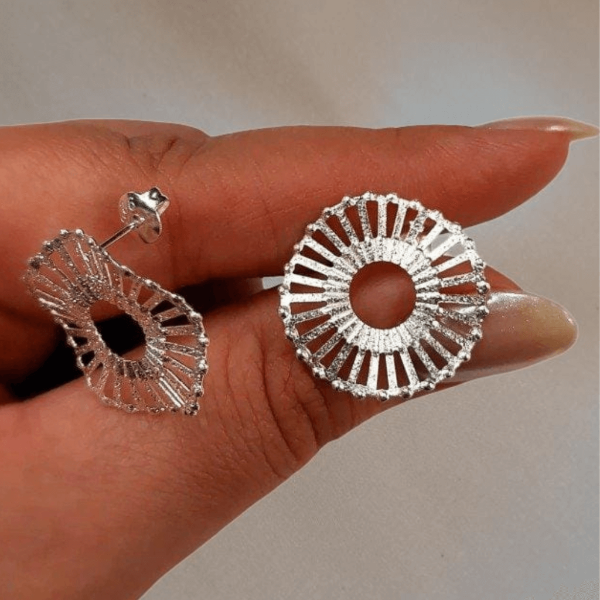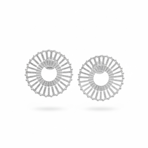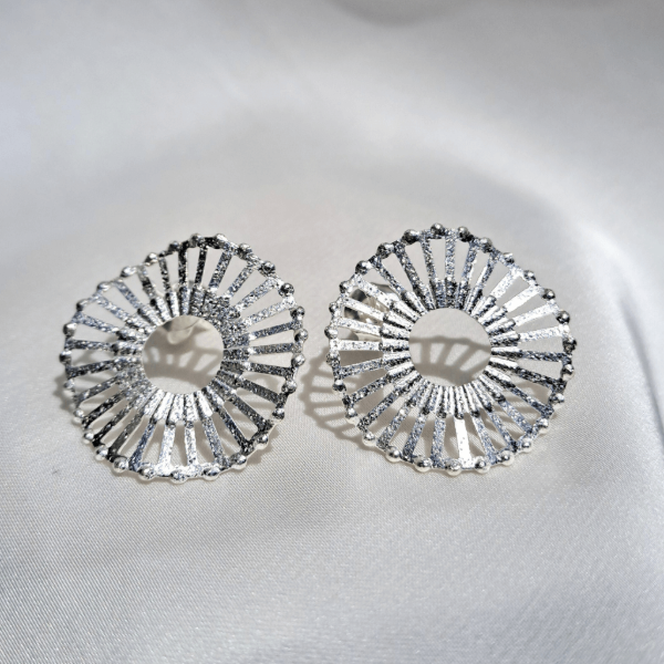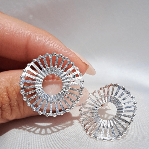 Aros pasantes de Plata 925 con diseño circular calado y textura sutil. Cierre mariposa. Livianos y cómodos, realzan con un estilo moderno y delicado. Ideales para usar tanto de día como de noche y sumar un toque especial a cualquier look.