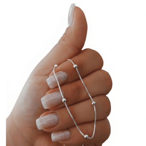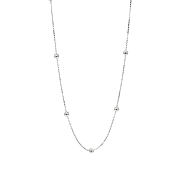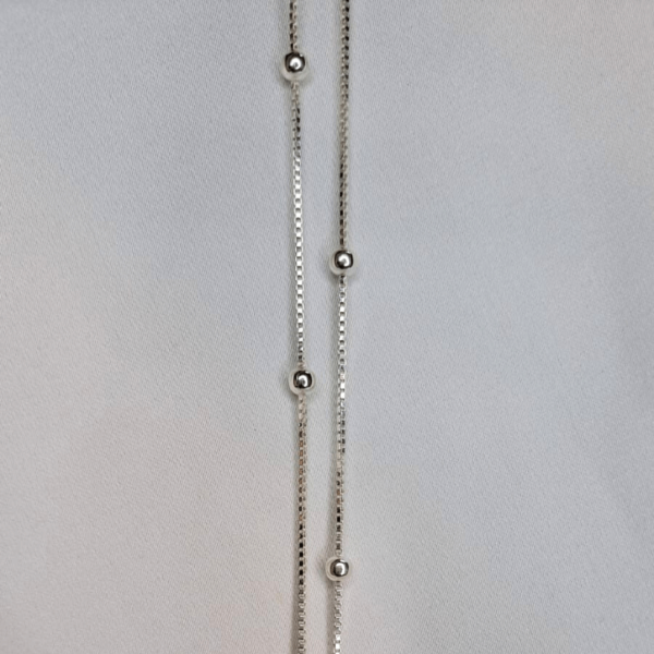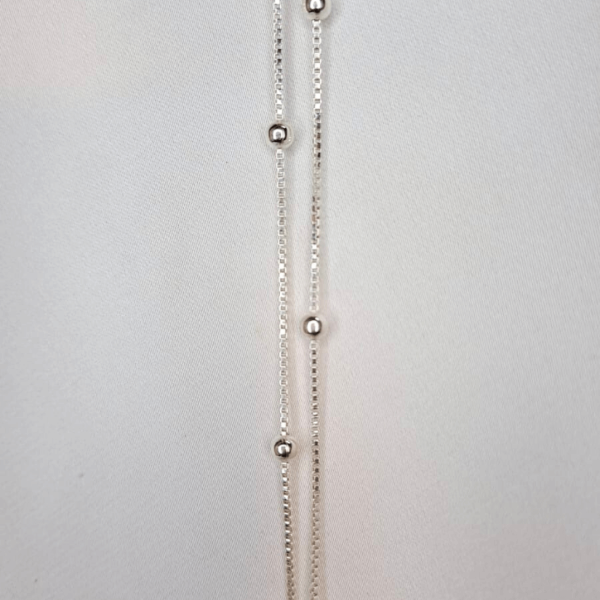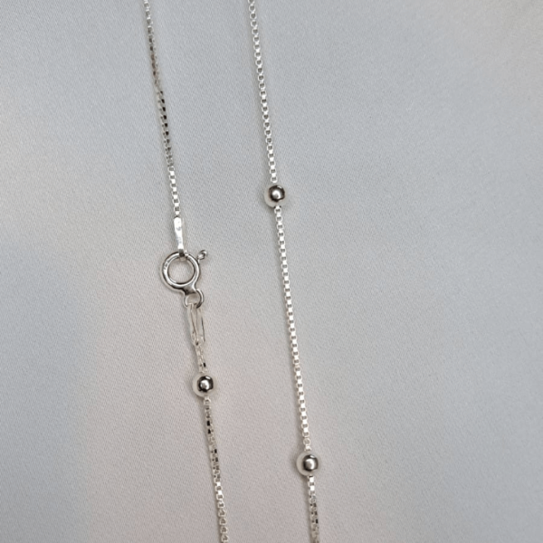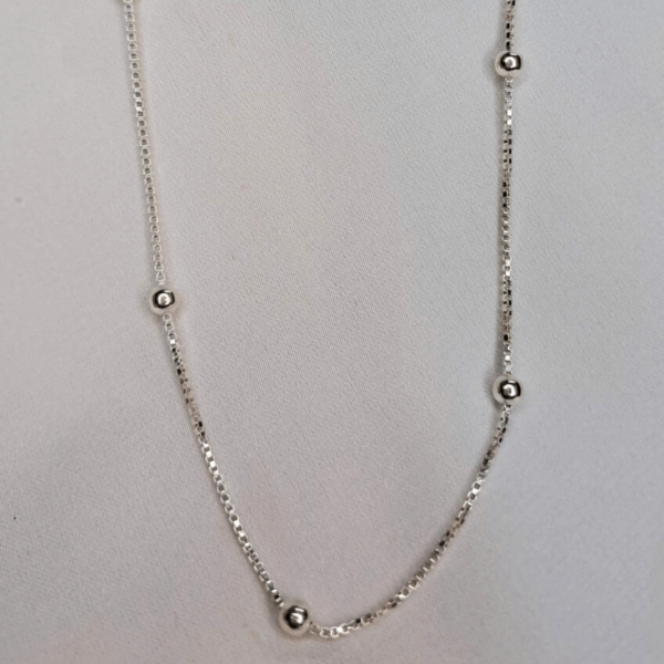 Cadena de Plata 925 con eslabón veneciano y delicadas "esferas" "bolitas fijas a lo largo del diseño. De 45 cm de largo, es una pieza sutil y luminosa, ideal para usar sola o combinar con dijes. Un detalle simple que eleva cualquier look.