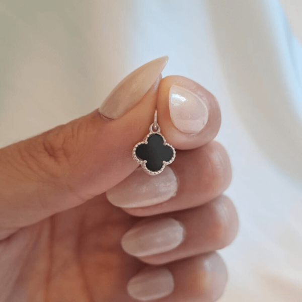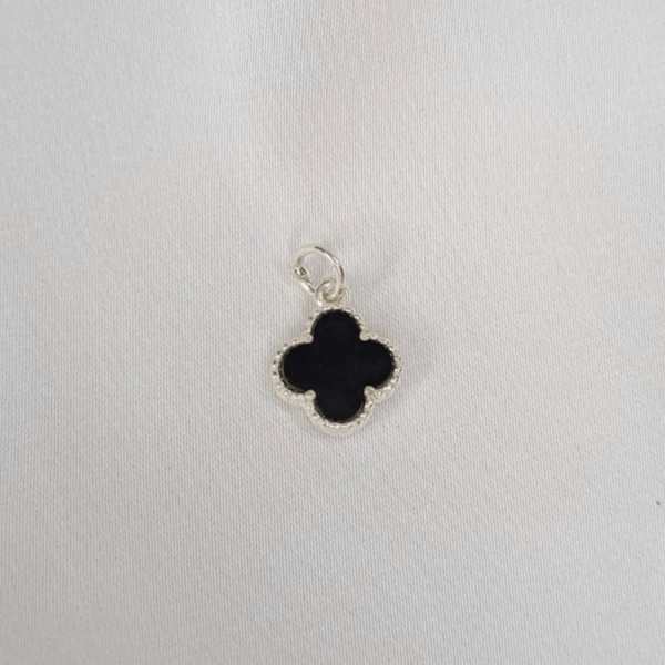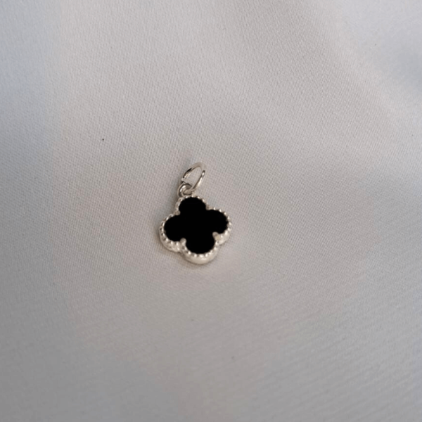 Dije de Plata 925 con diseño inspirado en el clásico Van Cleef y detalle de ónix negro. Una pieza elegante y atemporal, ideal para sumar sofisticación a tu cadena favorita.