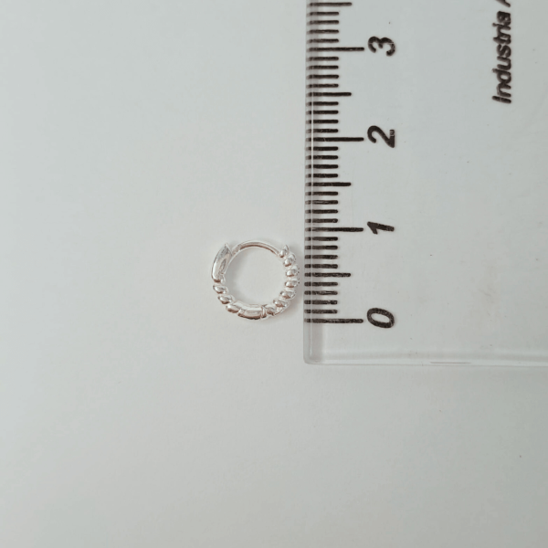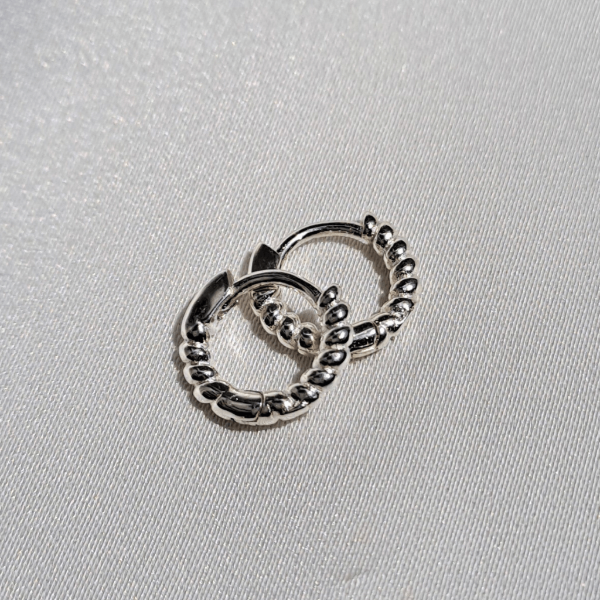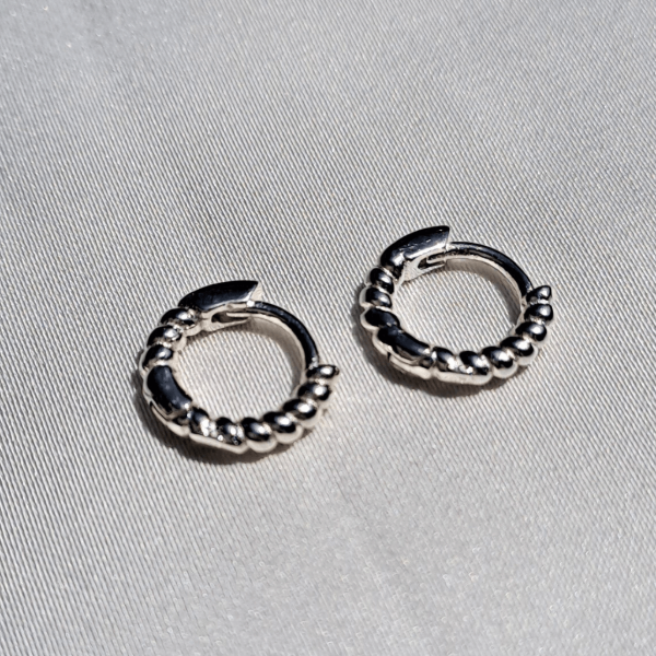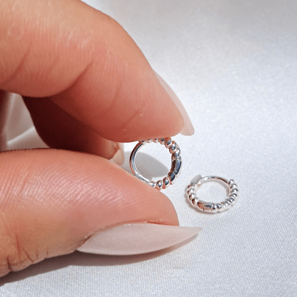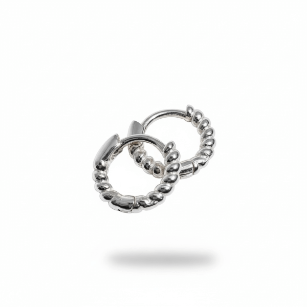 Argollitas Mini de Plata 925 con delicado tramado Tipo Soguita. Un diseño sutil y atemporal, ideal para usar todos los días o combinar en múltiples perforaciones.