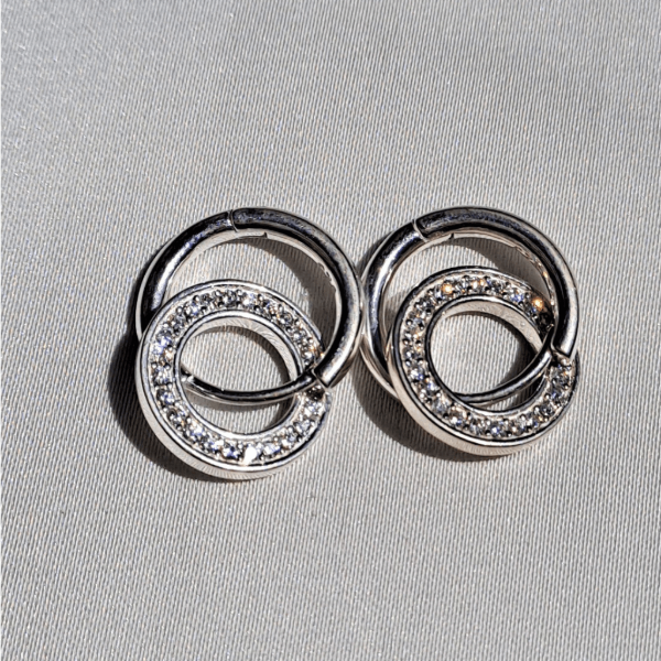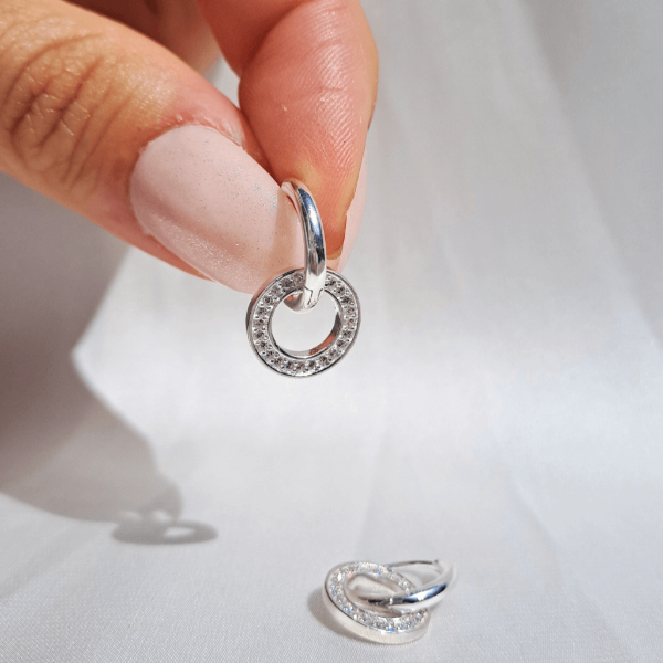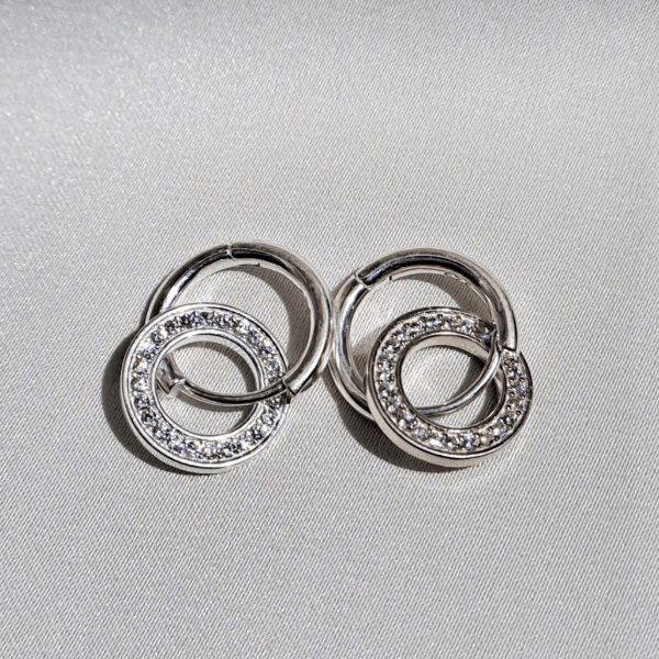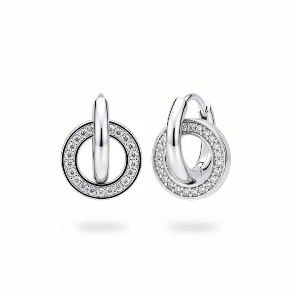 Aros colgantes doble circulo entrelazado con cubics de Plata 925. Un modelo elegante y moderno, ideal para realzar cualquier look, tanto de día como de noche. Tamaño 1,2 cm.