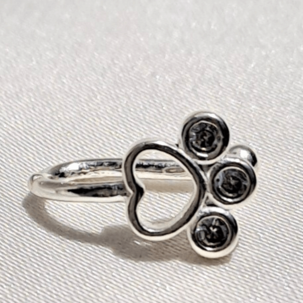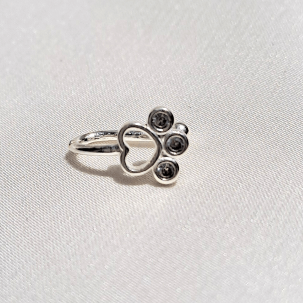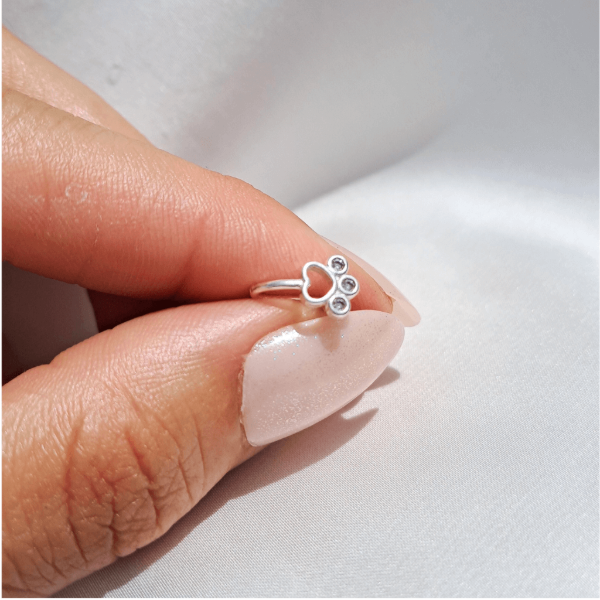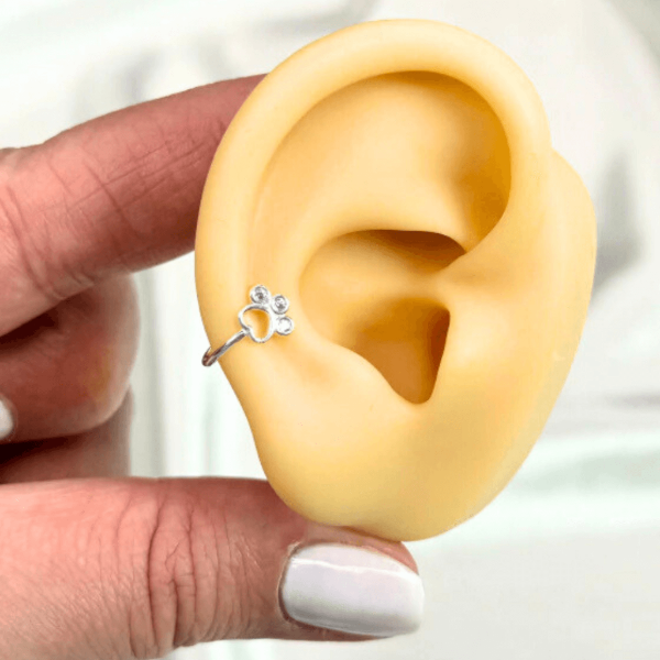 Aro solitario ajustable de Plata 925 con cubics y diseño de huellita. Se coloca en la parte media de la oreja, por encima del lóbulo, sin necesidad de perforación. Un detalle delicado y luminoso, fácil de llevar y ideal para combinar con otros aros.