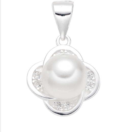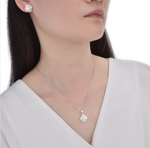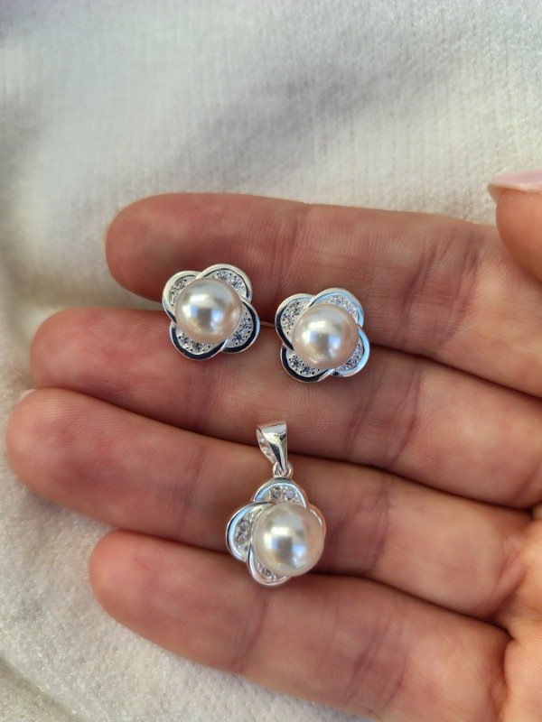 Set de aros y dije de Plata 925 y perlas con forma de flor y cubics.
